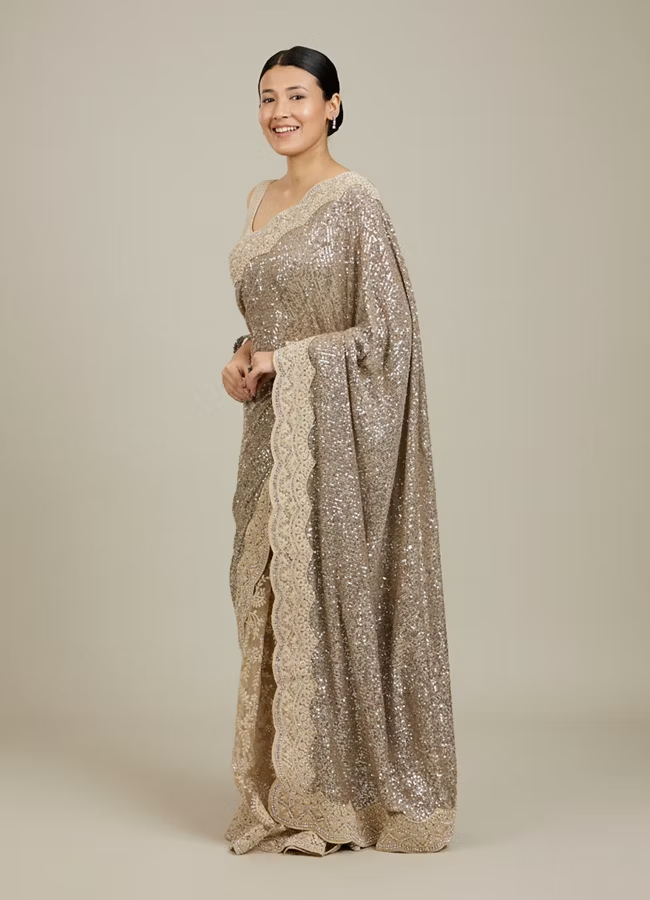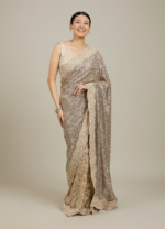 - DescriptionExperience the soft glam look of this sandstone beige saree, adorned with bel buti patterns embellished with rhinestones and sequin work, finished with an embroidered scalloped hem. Pair with pearl jewellery to embrace its subtle allure.