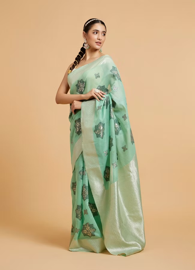 - DescriptionEmbrace timeless elegance with this stunning sea green saree adorned with intricate floral motifs in luxurious zari work. The delicate shimmer of the zari beautifully contrasts with the soft sea green hue, creating a regal yet graceful look. Perfect for weddings or festive occasions, the lightweight fabric ensures comfort while exuding sophistication. Pair it with gold jewelry and a matching blouse for a flawless, festive look.