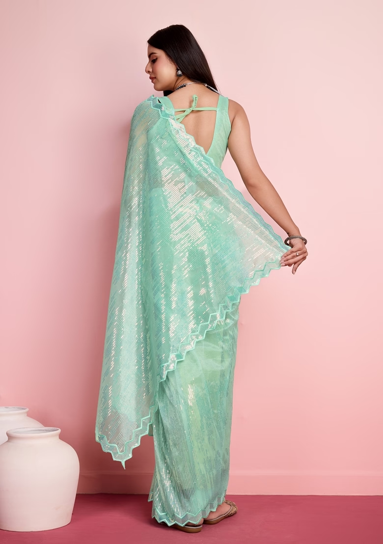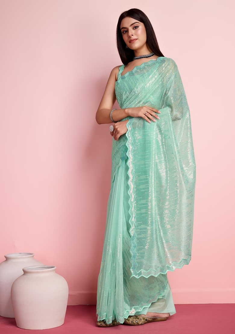 Sea Green Sequin Thread Embroidered Net Saree Set – XSR23347
