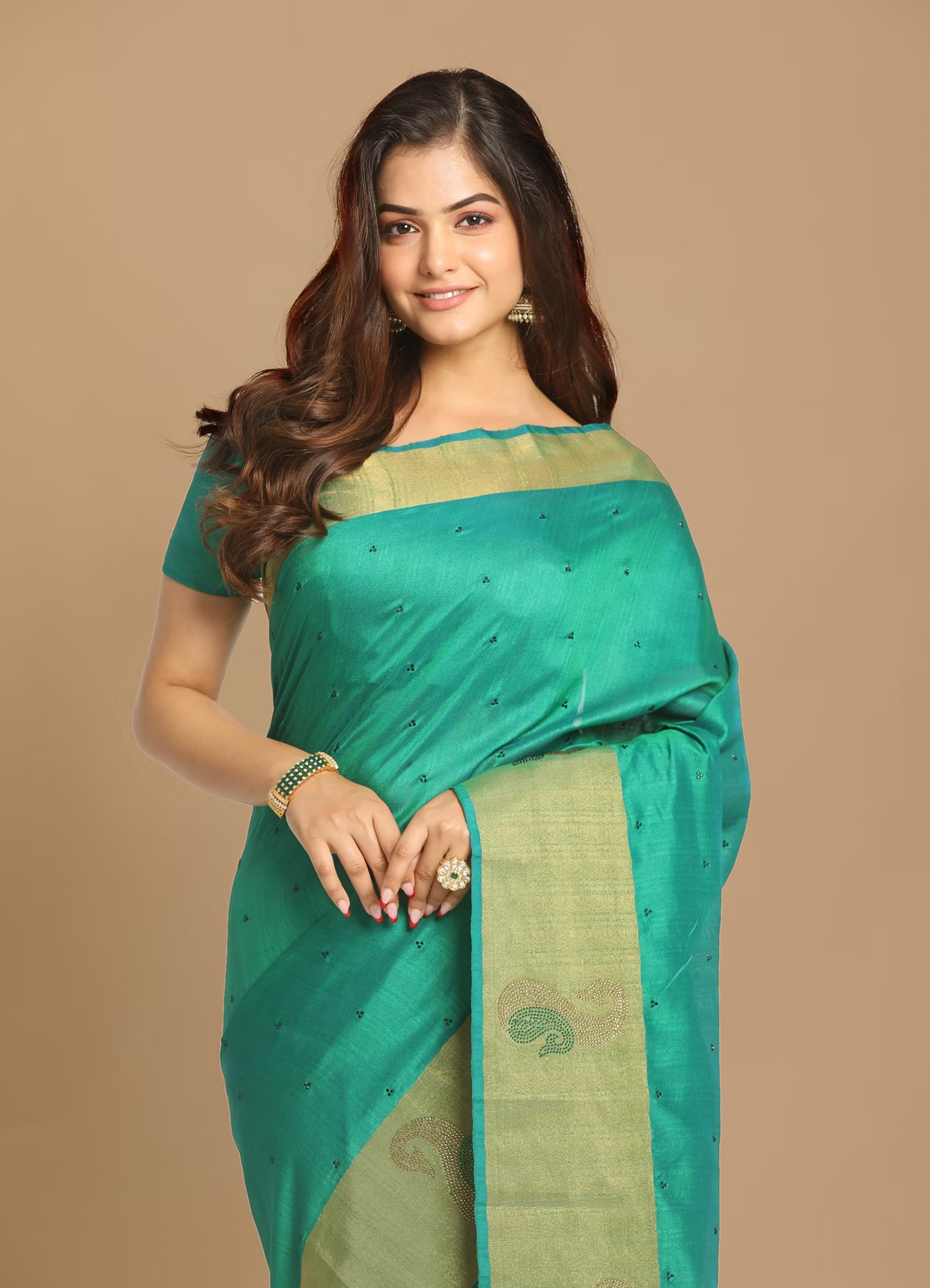 - DescriptionThe sensational dark green saree is all you need to raise the fashion bar high on any occasion. Get this gorgeous drape and turn heads as you walk in! Shop now!