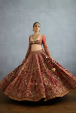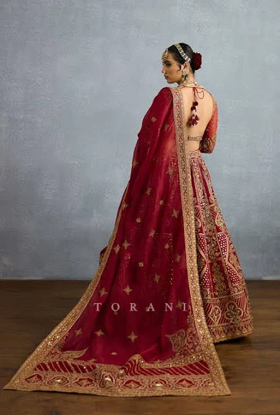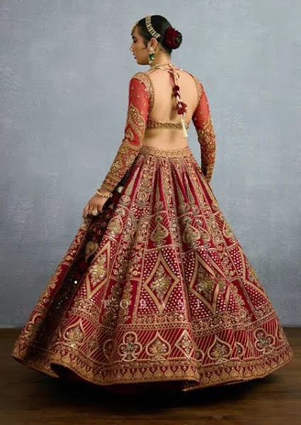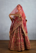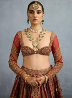 The Shamse Tania Lehenga set is a gorgeous ode to Indian craftsmanship. Crafted in lush organza and jeni silk, the sacred deep red shade creates an effect of regal elegance. Featuring the most intricate zari embroidery, dabka, and heritage badla work, the lehenga is a vision of luxury.