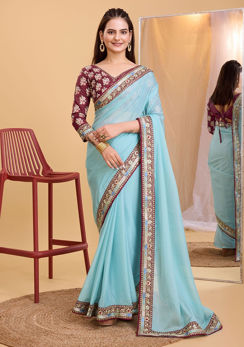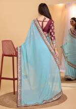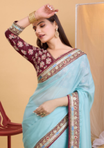 Sky Blue Embroidered Organza Saree Set