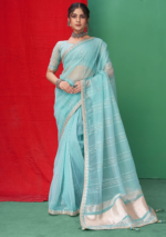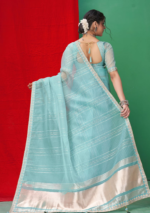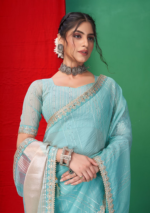 Be the first to review “Sky Blue Woven Sequin Embroidered Organza Saree Set”