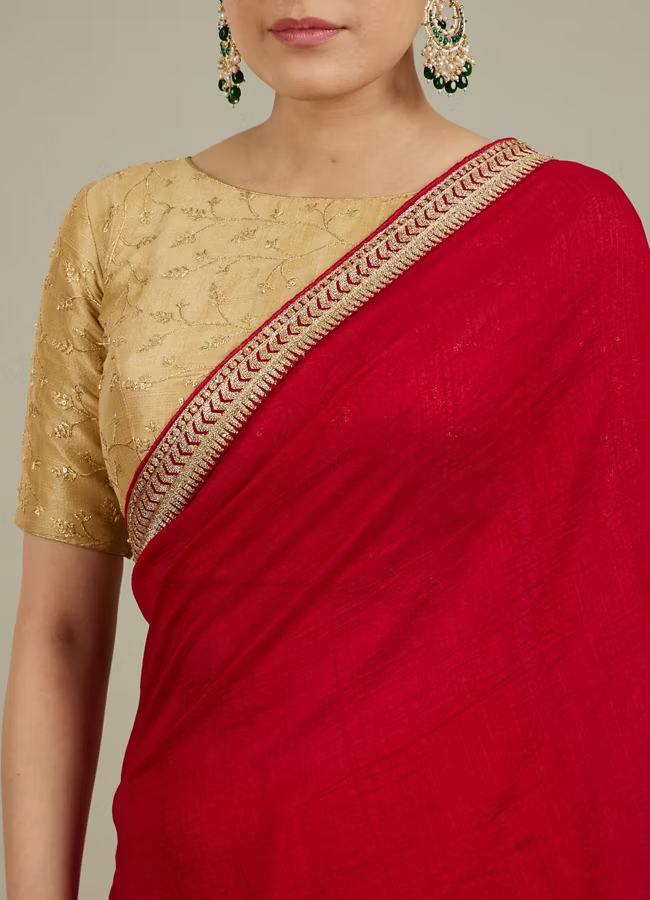 - DescriptionImmerse yourself in tradition with this Garnet Red Saree crafted meticulously for festive wear. The hand-embroidered Art Silk is embellished with intricate Zari work and sparkling Stone detailings, enhancing its opulence. Perfect for all your Mehendi ceremonies.