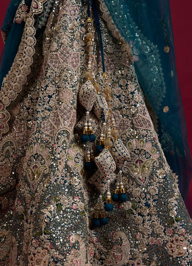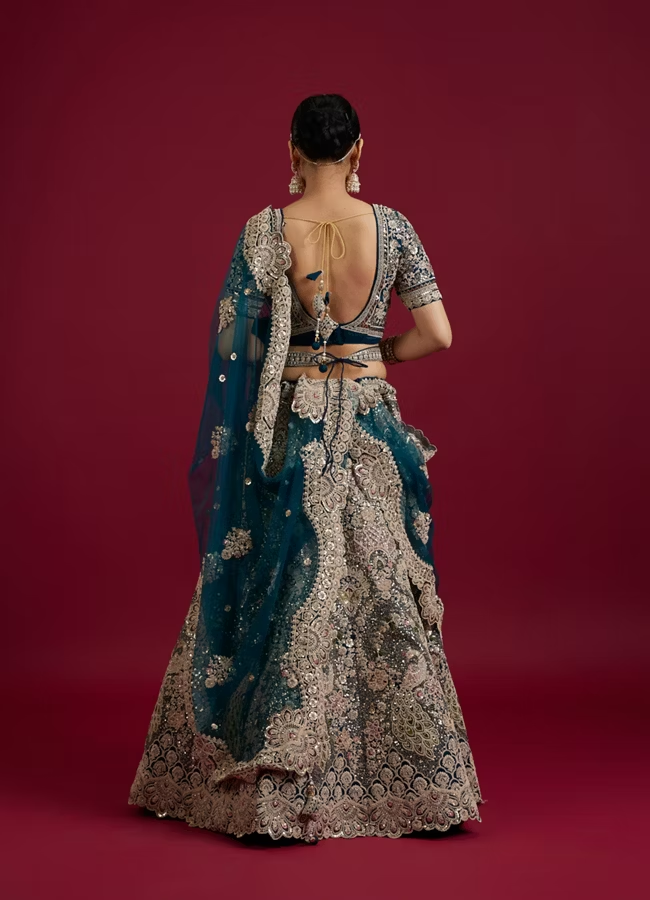 Teal Blue Sequinned Lehenga with Jaal Pattern And Peacock Motifs