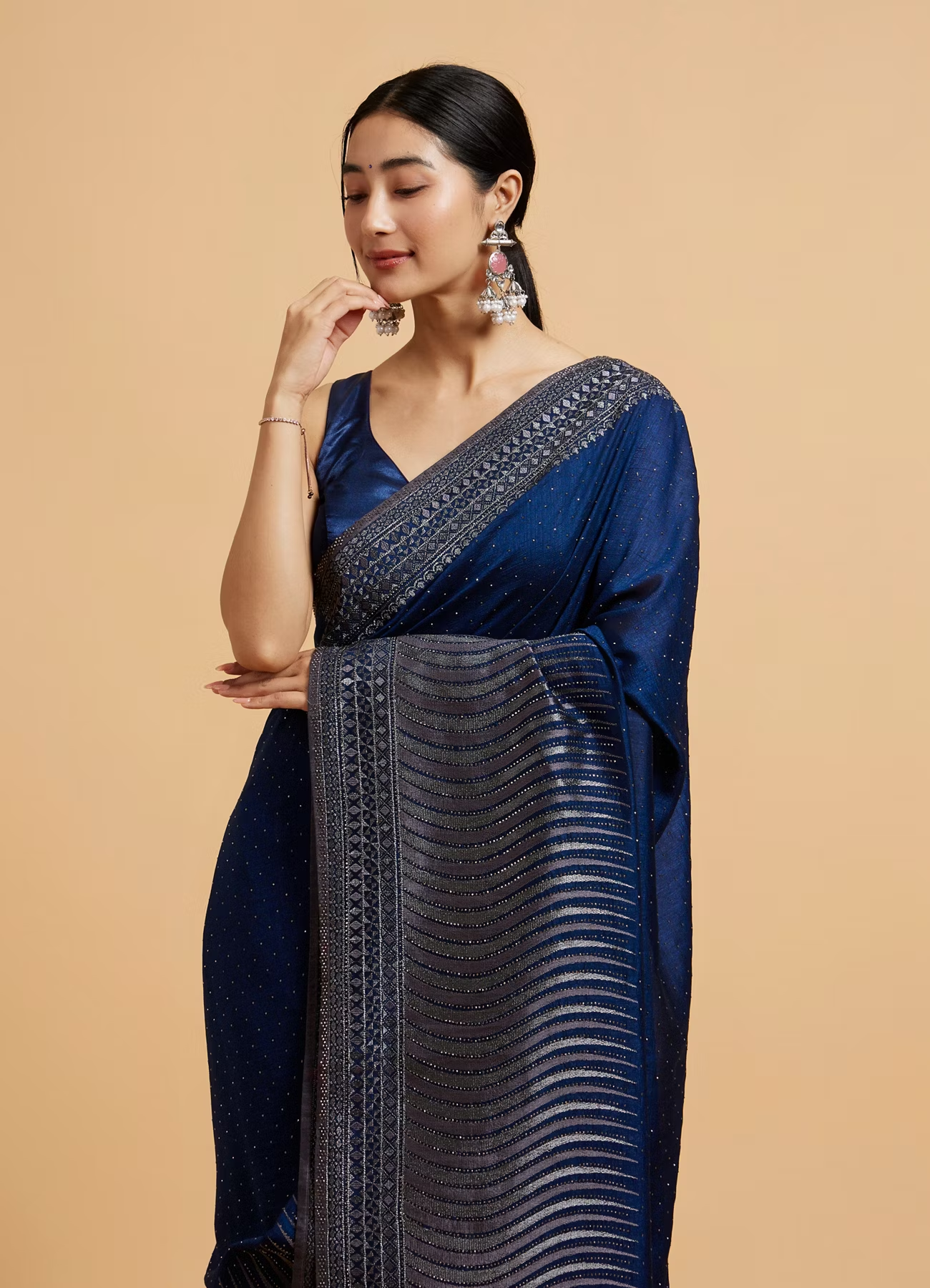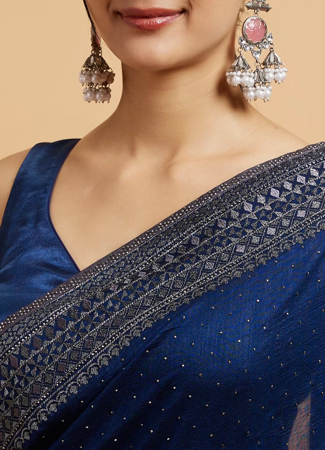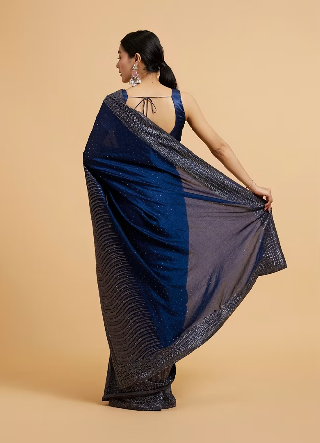 - DescriptionDive into elegance with this teal blue wave patterned saree, crafted with shimmering rhinestones for that touch of glam! The delicate wave design flows effortlessly, adding both grace and charm. Perfect for evening soirees or festive celebrations. Add a rhinestone-encrusted clutch and silver stilettos to elevate the glam quotient!