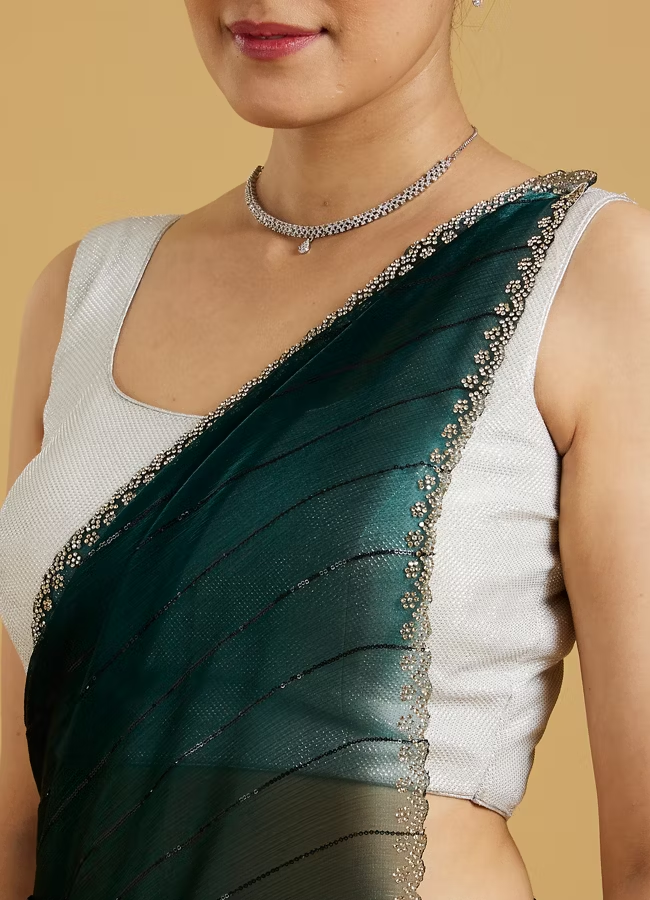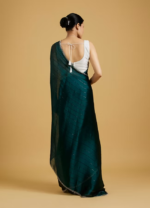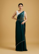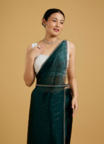 - DescriptionEnvision the timeless elegance of our Tranquility Green Saree with its vibrant hue. Crafted in premium Organza, this saree delights with its sheer beauty. The enhanced with a matching belt to underline your natural grace. Perfect for festivities and special occasions.