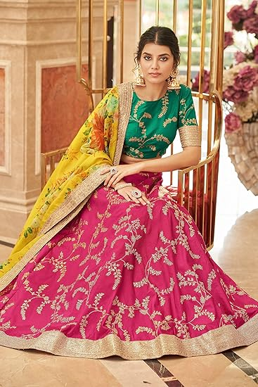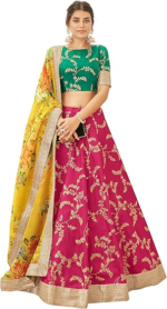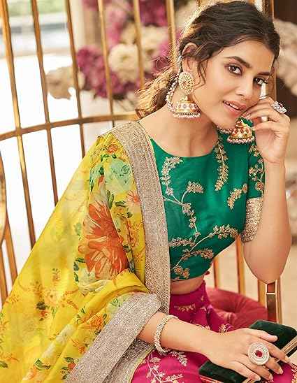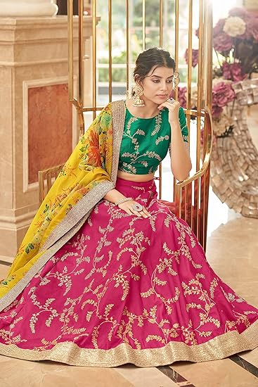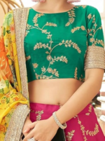 - Color: Lehenga: Pink; Blouse: Green ; Dupatta: Yellow