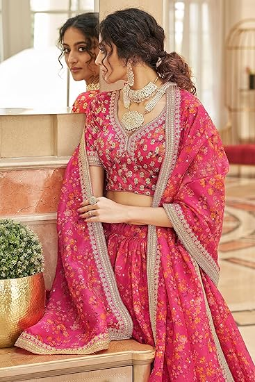 TRENDMALLS Women’s Pink Silk Blend Sequence Embroidery Floral Print Lehenga Choli with Dupatta For Women-L154-Pink (Wedding-Bridal-Latest-Lehenga-Choli_Free Size)