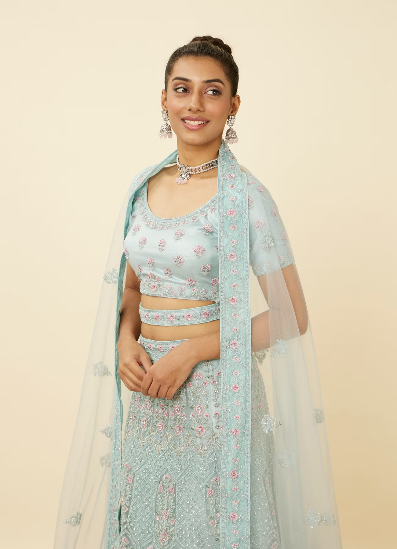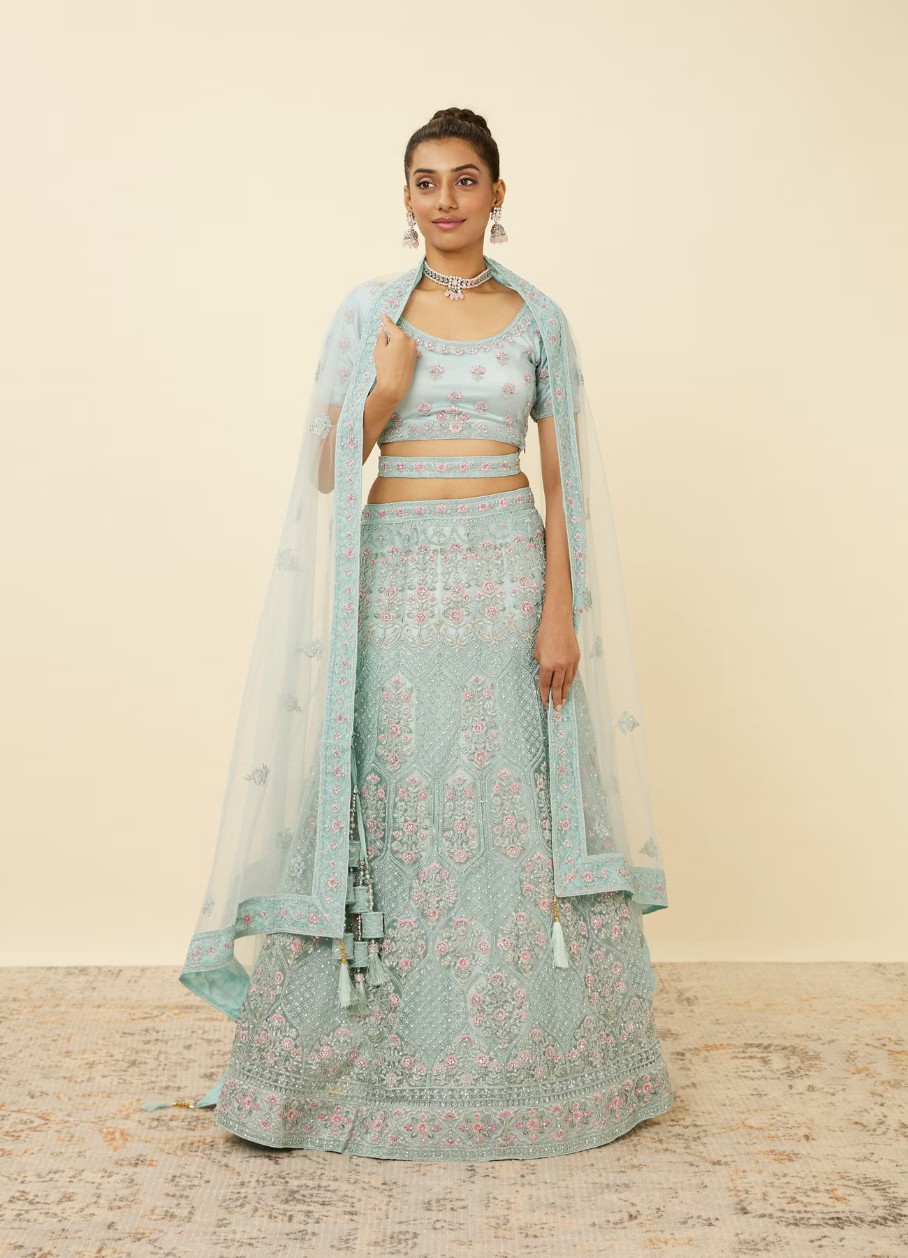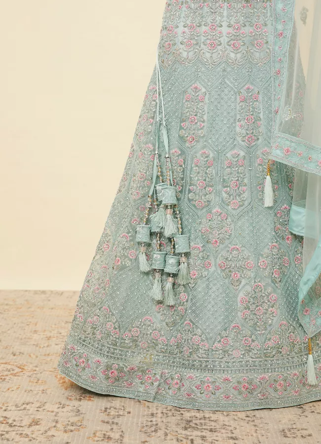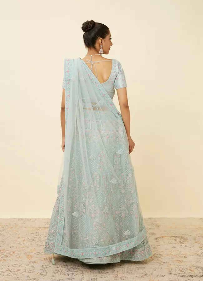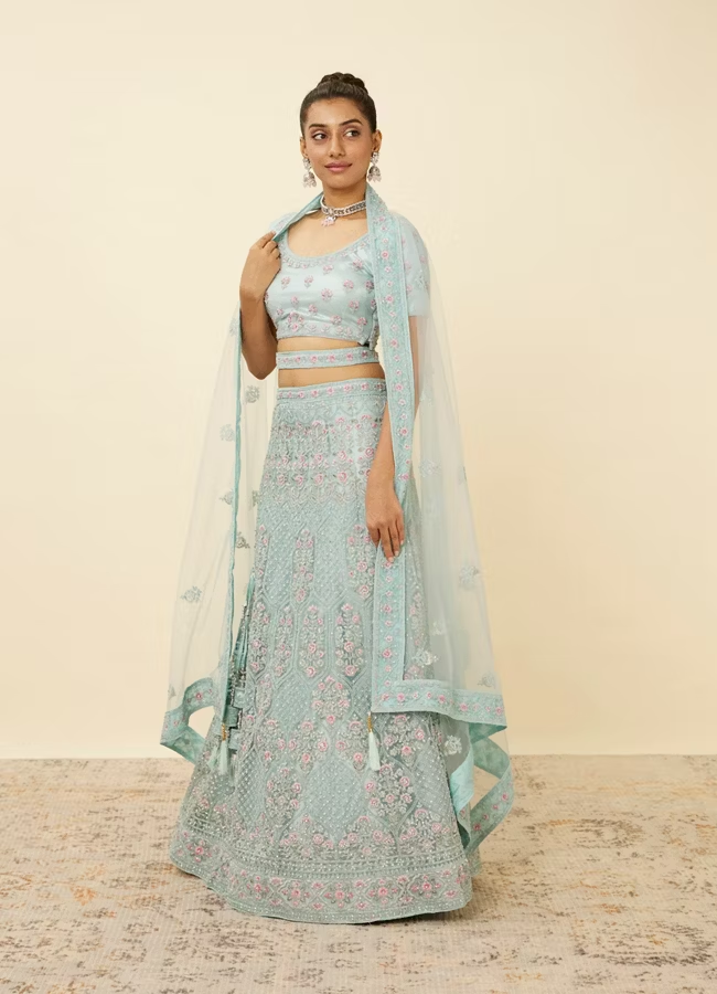 • DescriptionStep into a tropical paradise with this tropical blue floral patterned lehenga adorned with sequin work and ogee patterns. Accessorise this ensemble with silver toned jewellery for an enchanting look.