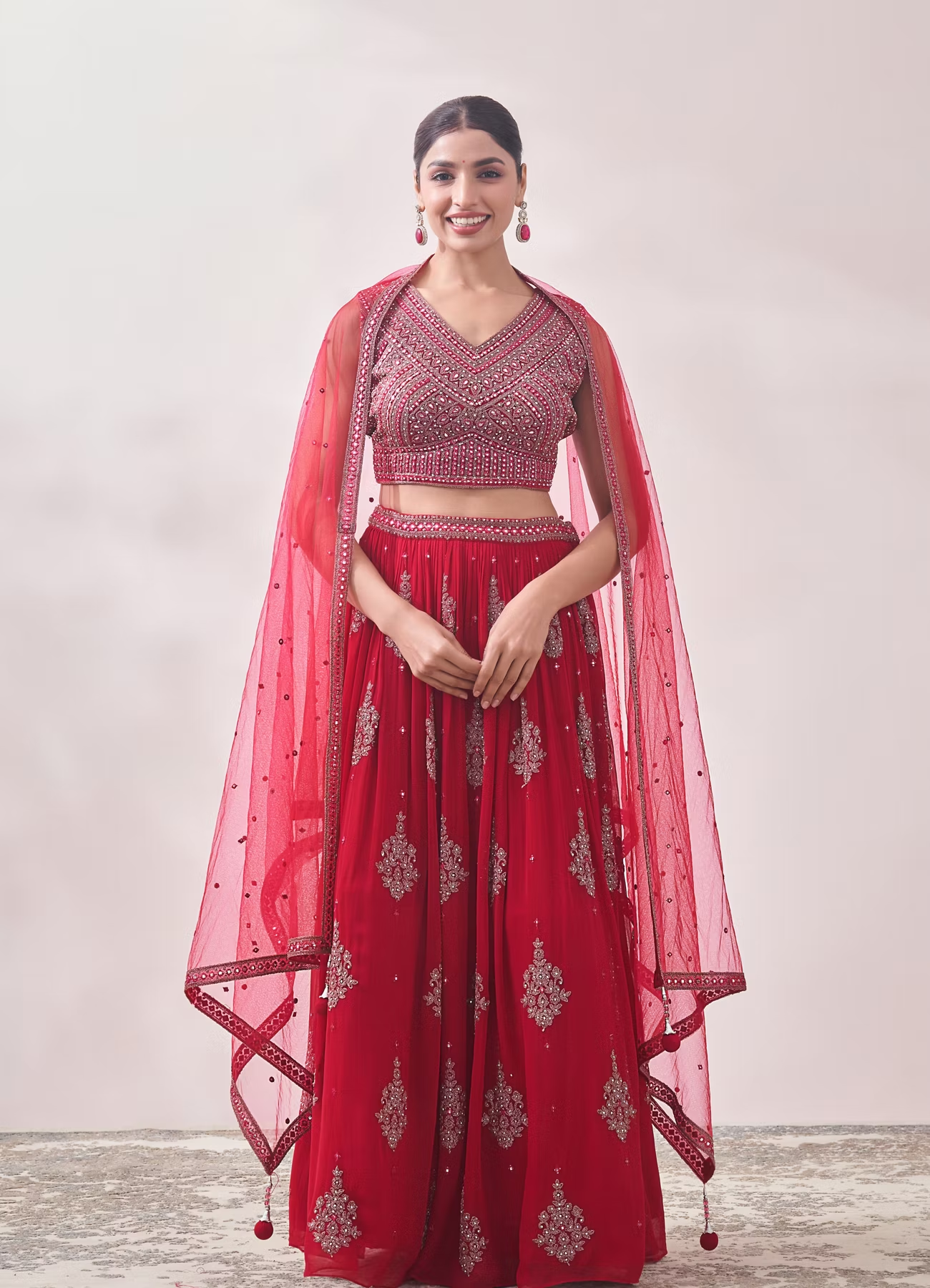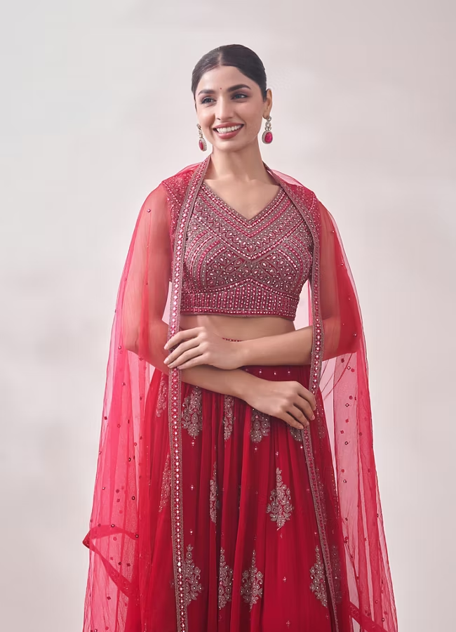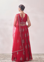 - DescriptionA v-neck, sleeveless blouse illuminated with mirror work is paired with a gathered skirt in this true red skirt and top set. The back is designed with a v cut and a dori with potli trims. Made from flowy georgette, the skirt features ornate jhallar motifs embroidered in shimmery thread and an embellished waistline to match the blouse. A sheer red dupatta studded with glistening mirrors and a decorated border completes the ensemble. Style this attire with glittery golden heels and diamond studded jewellery.