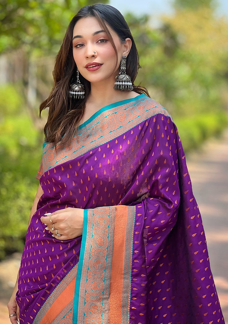Violet Zari Woven Soft Silk Saree Set