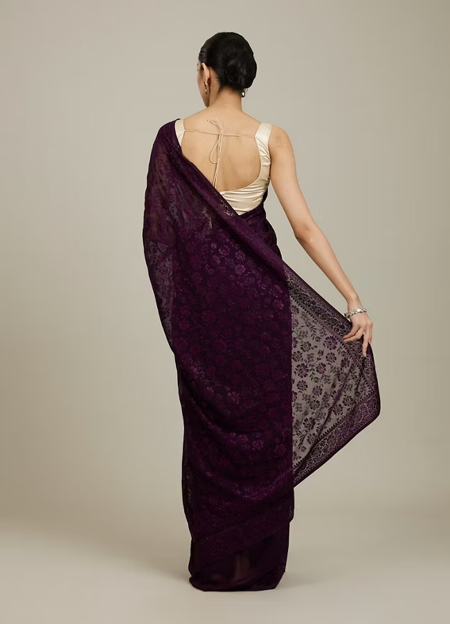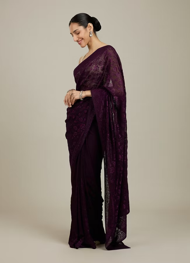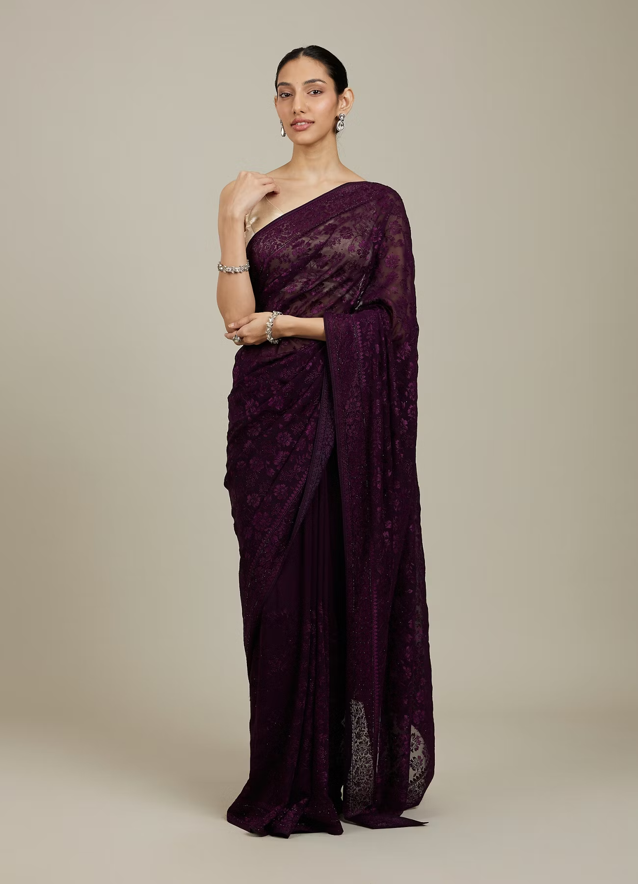 - DescriptionUnveil your sophistication with our Wine Bel Buti Patterned Saree adorned with shimmering rhinestones. This exquisite piece features intricate bel buti motifs that add a touch of opulence to its rich, wine-colored fabric. Perfect for special occasions, the saree’s delicate sparkle and luxurious drape make it an eye-catching choice. Style it with a sequined blouse and delicate silver jewelry to enhance its glamorous appeal.