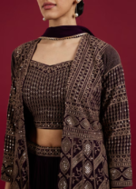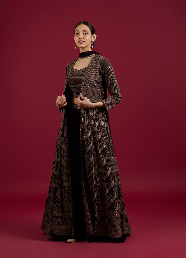 - DescriptionEmanate grace and sophistication with this Wine Delight Chiffon Lehenga. The stunning wine color combined with the soft, comfortable chiffon material promises you a regal presence at any occasion. The set includes top, lehenga, jacket, and a dupatta offering a complete, exquisite look.
