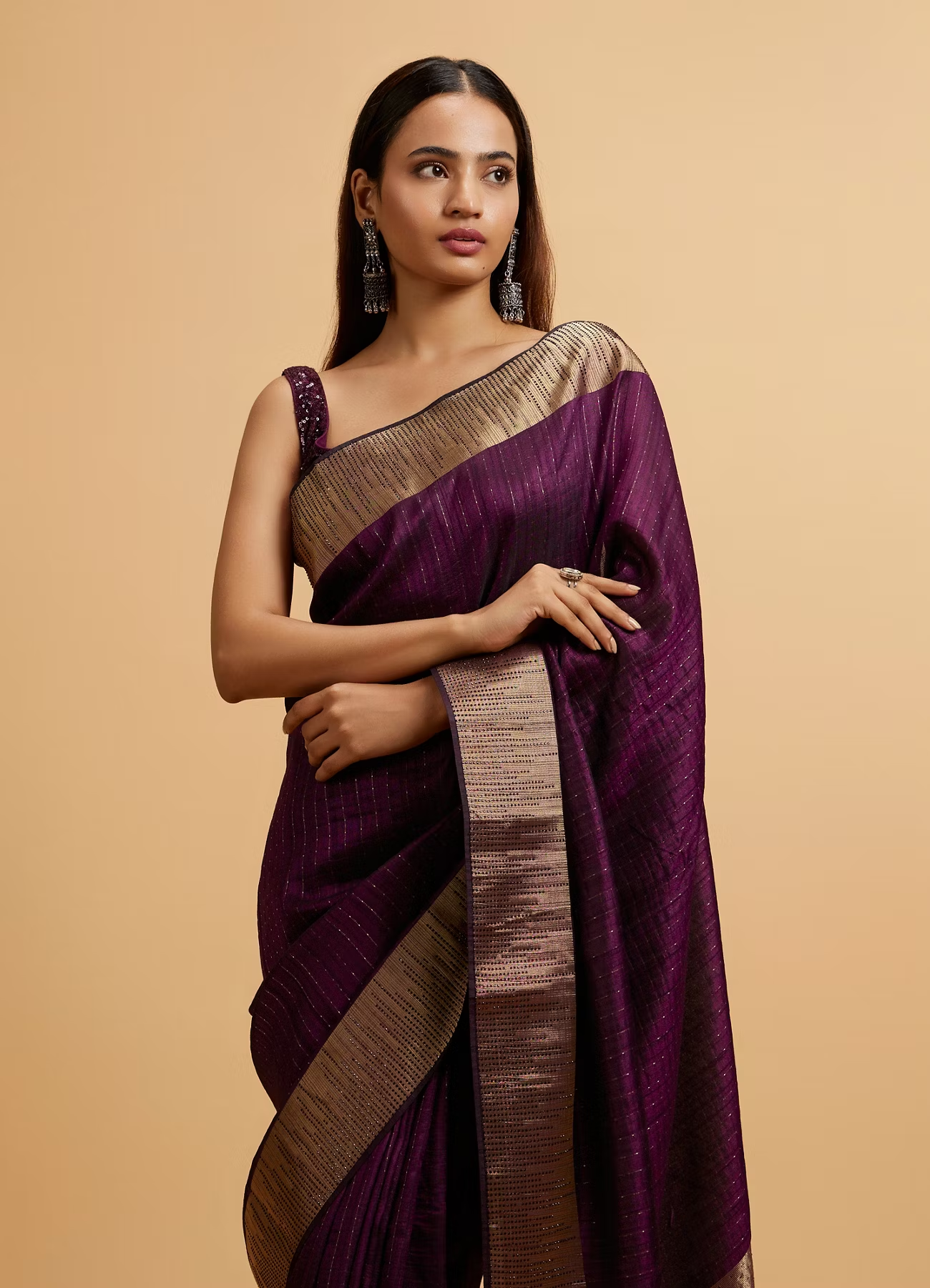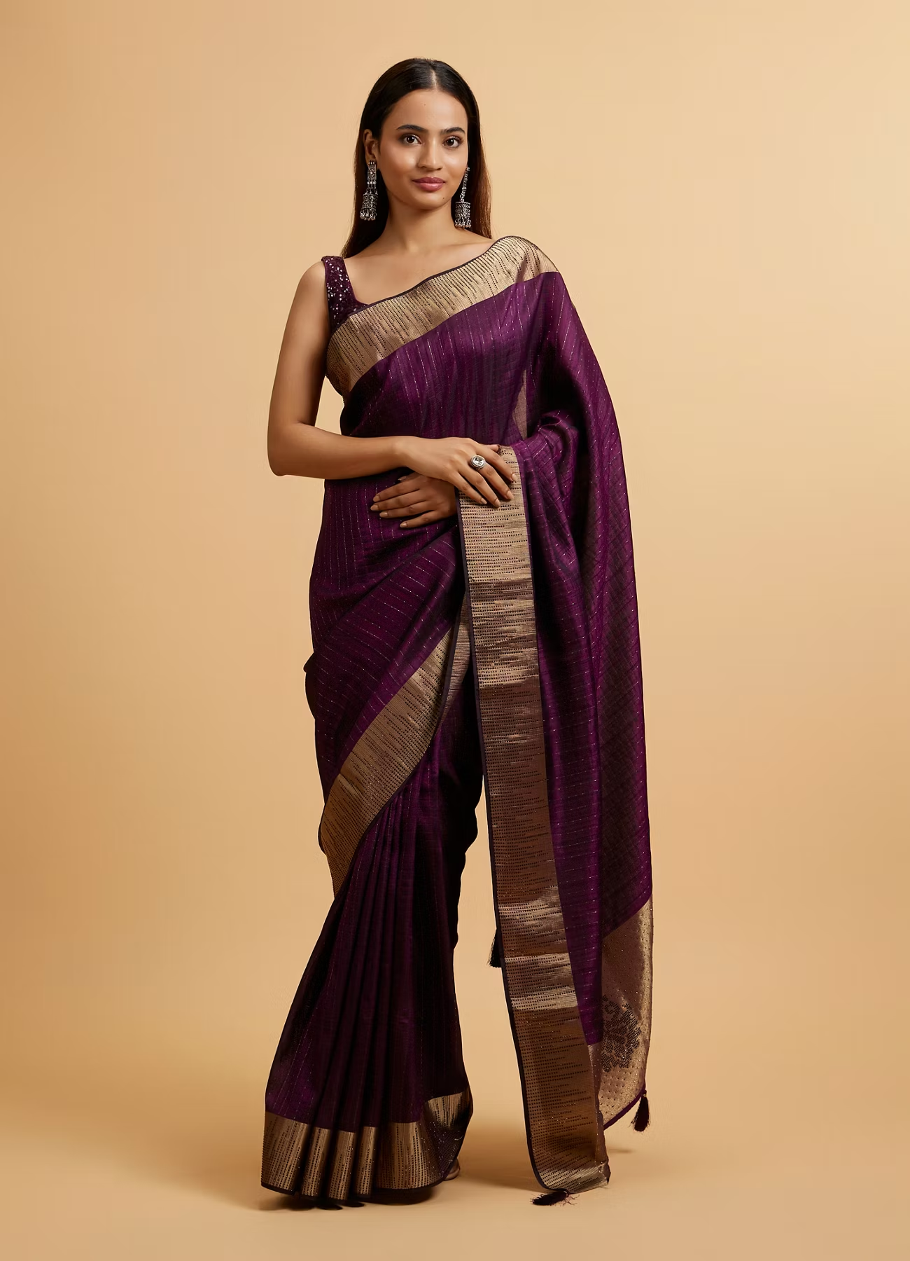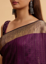 • DescriptionThis stunning wine linear patterned rhinestone Saree features sleek linear designs adorned with sparkling rhinestones, creating a mesmerizing interplay of texture and light. The rich wine hue exudes sophistication, perfect for evening galas or festive celebrations. Crafted from premium fabric, this saree drapes beautifully, ensuring both comfort and grace. Pair with statement diamond earrings and a sleek updo for a glamorous look. Add metallic stilettos to complete this show-stopping ensemble.