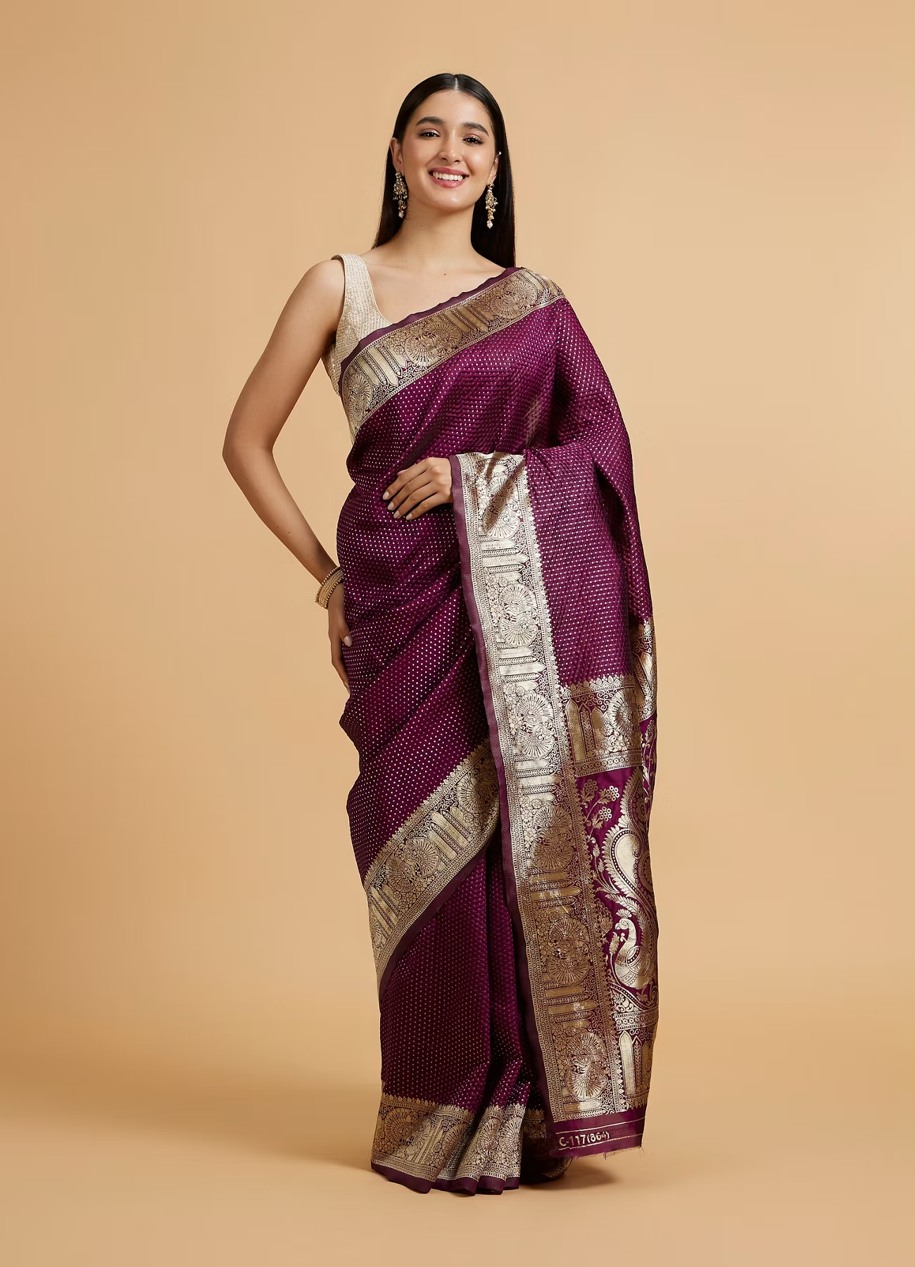 Wine Red Dotted Patterned Saree with Peacock Zari Motifs on the Border
