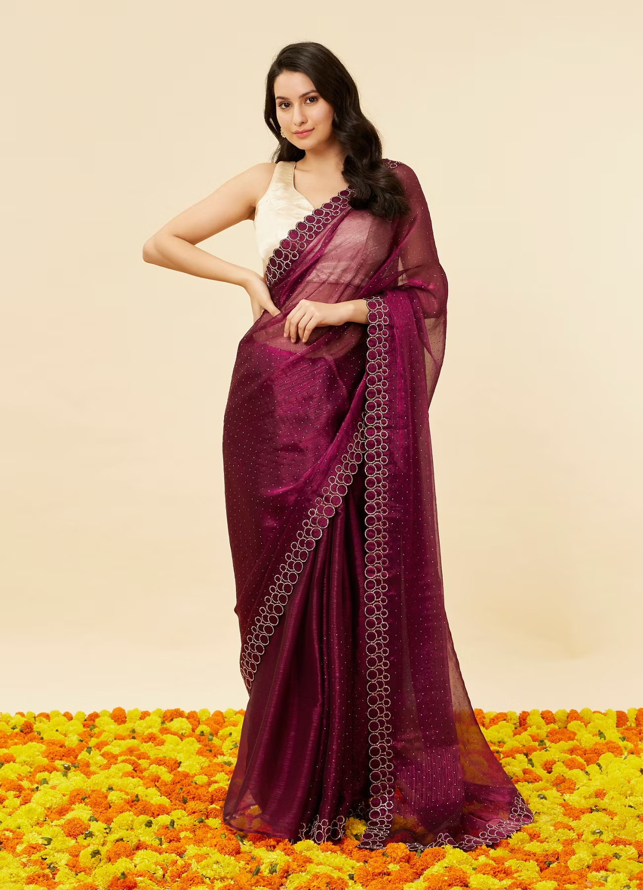 • DescriptionDive into the shimmering allure of this wine red saree, lavishly adorned with rhinestone embellishments. The circular rhinestone-studded patterns along the border add a touch of modern elegance. Pair this saree with sleek gold jewellery and matching strappy heels.