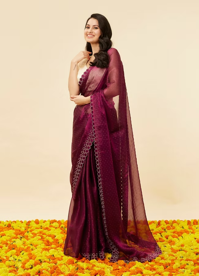 Wine Red Rhinestone Embellished Saree