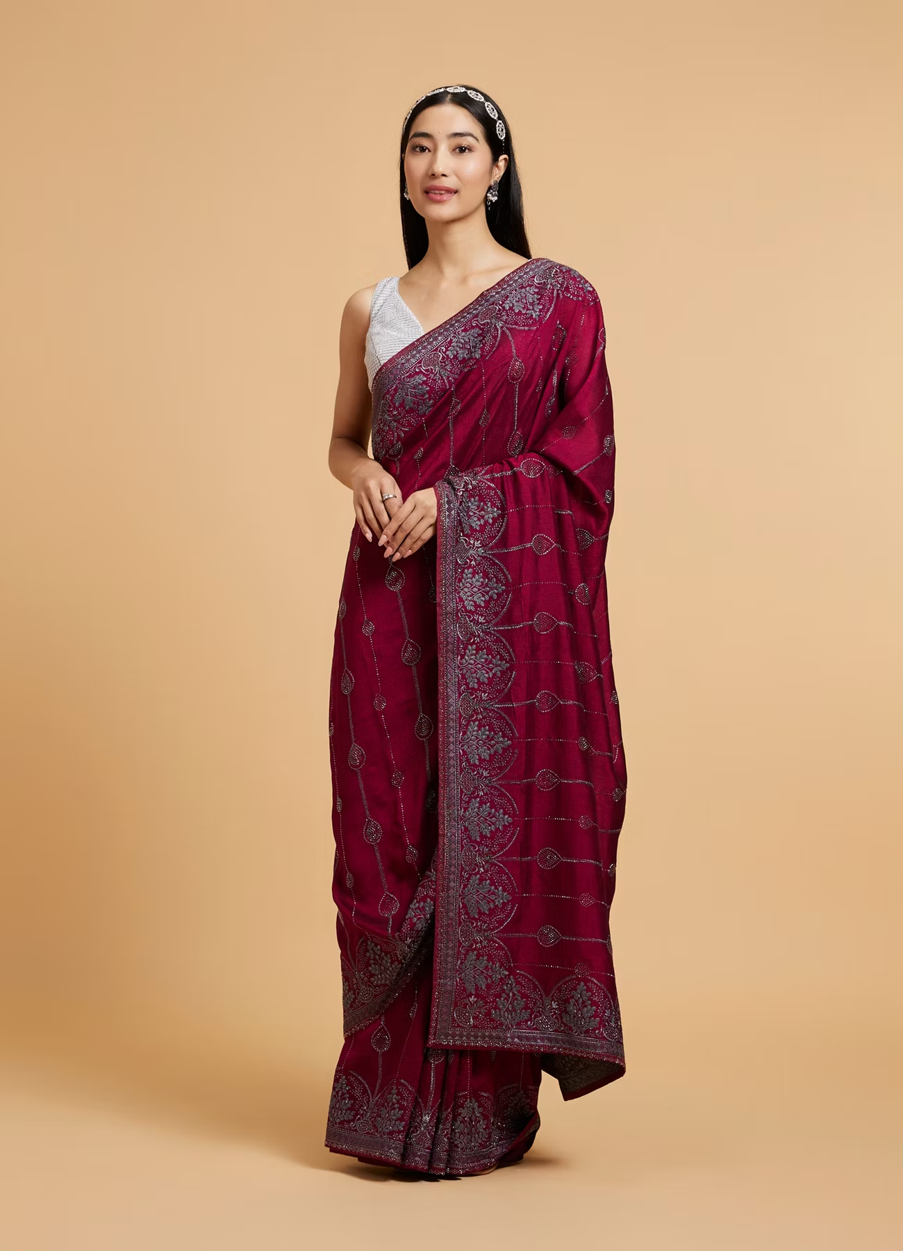Wine Red Rhinestone Work Saree with Drop Motifs
