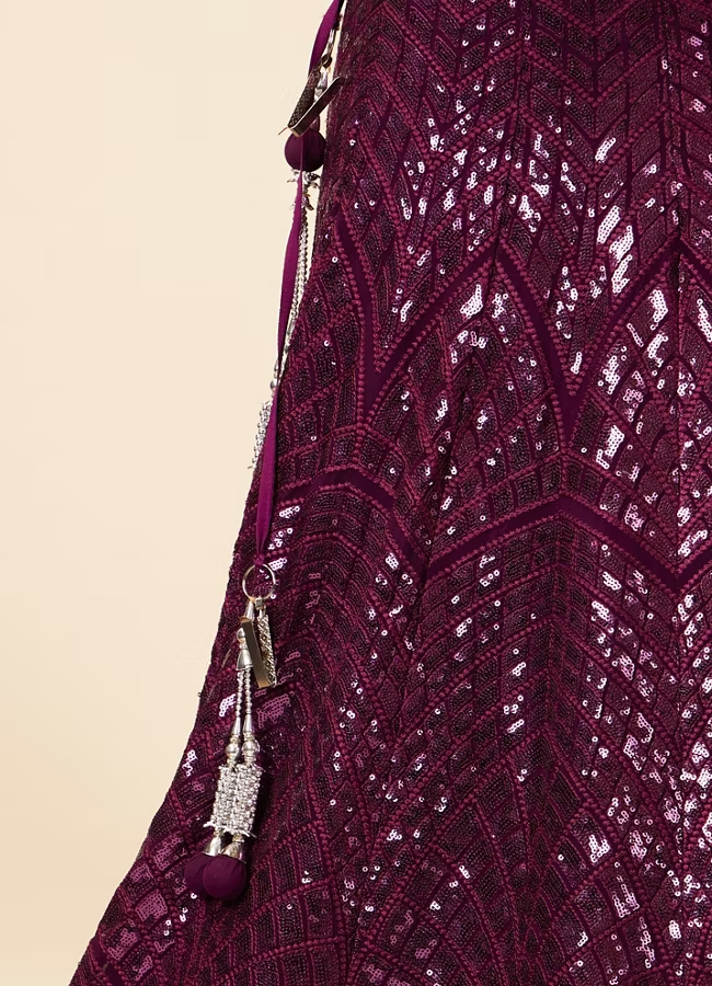 - DescriptionCrafted with radiant sequins shimmering through abstract pattern, this wine coloured lehenga is the ideal outfit for a dazzling cocktail celebration. A heavily sequined skirt and frilled trims decorate the waist tie. The skirt is coupled with a coordinated blouse. A matching waist belt and sheer dupatta complete the ensemble. Accessorise the look with embellished diamond jewellery to don your look.