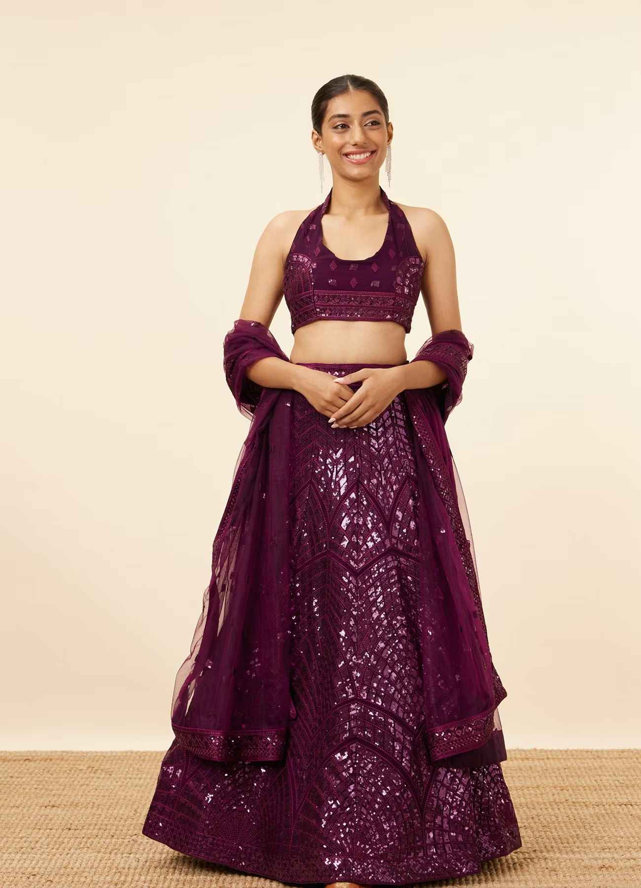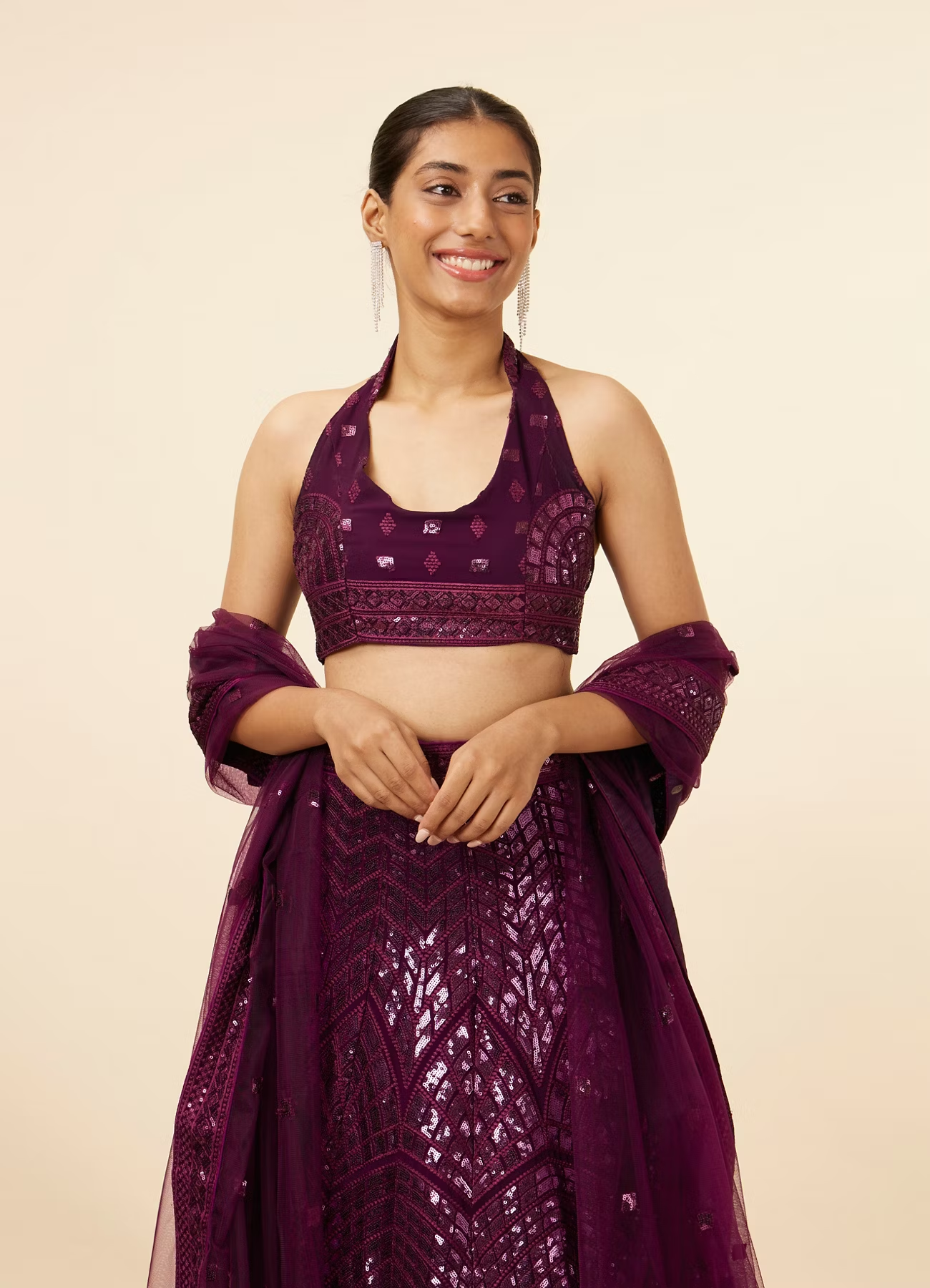 - DescriptionCrafted with radiant sequins shimmering through abstract pattern, this wine coloured lehenga is the ideal outfit for a dazzling cocktail celebration. A heavily sequined skirt and frilled trims decorate the waist tie. The skirt is coupled with a coordinated blouse. A matching waist belt and sheer dupatta complete the ensemble. Accessorise the look with embellished diamond jewellery to don your look.