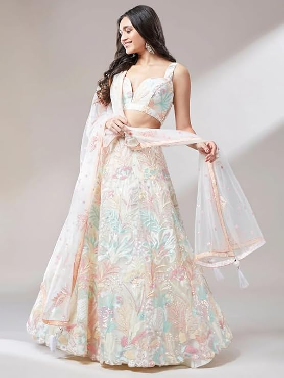 Zeel Clothing Women Off White Floral Organza Wedding Bridal Lehenga Choli for Women Stylish