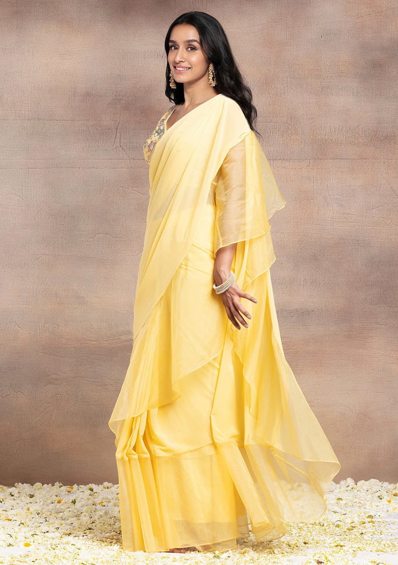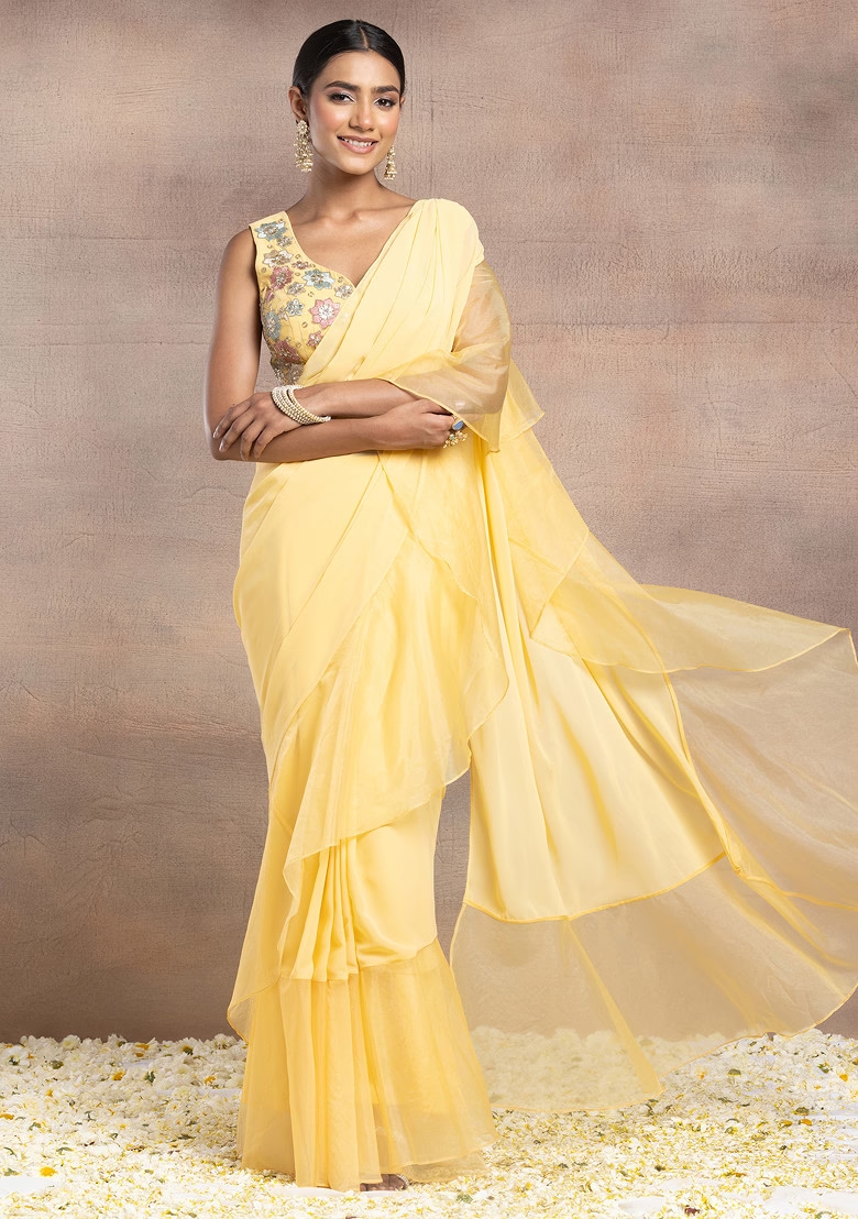 Yellow Pre-Stitched Saree Set With Floral Thread Hand Embroidered Blouse