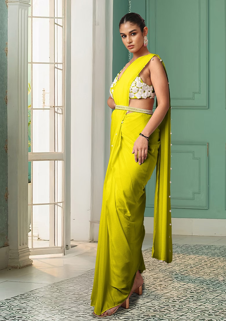 Yellow Pre-Stitched Saree Set With Hand Embroidered Blouse And Belt – DSS00212