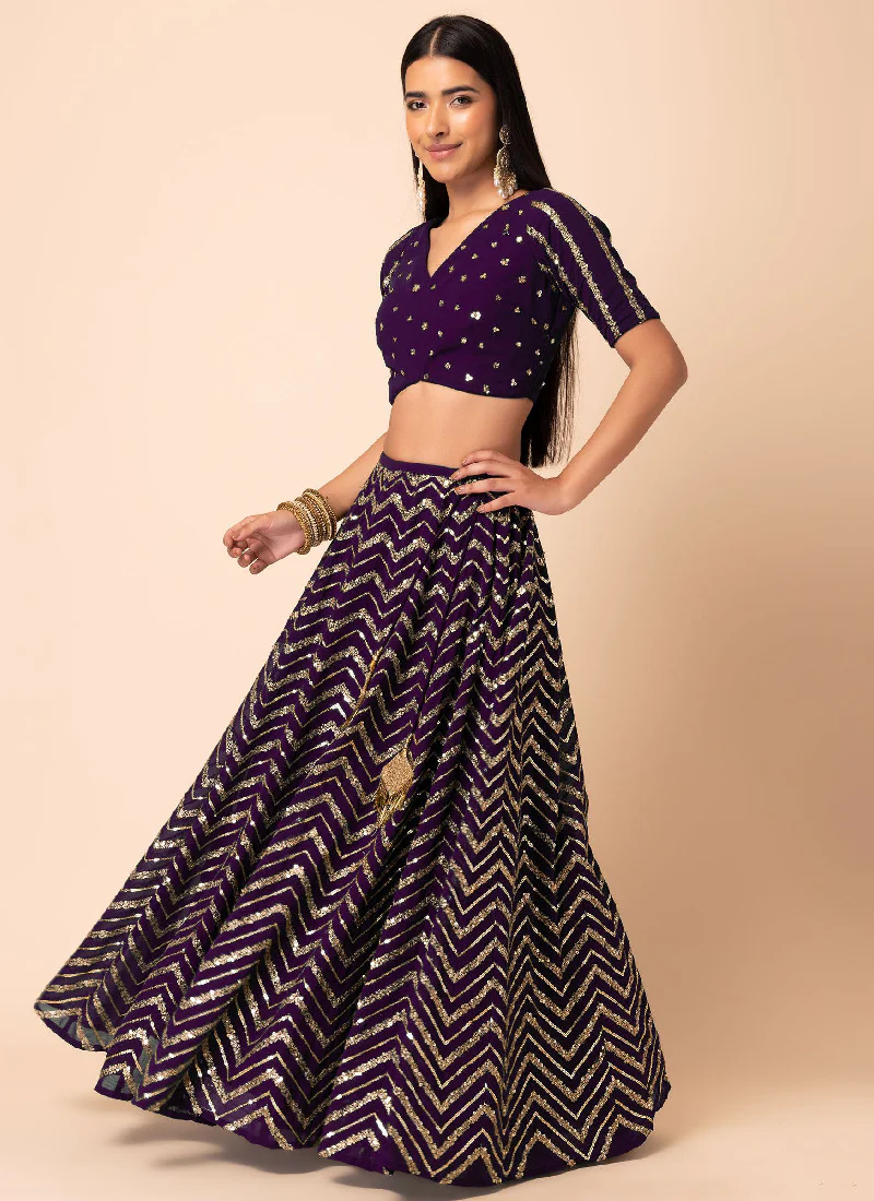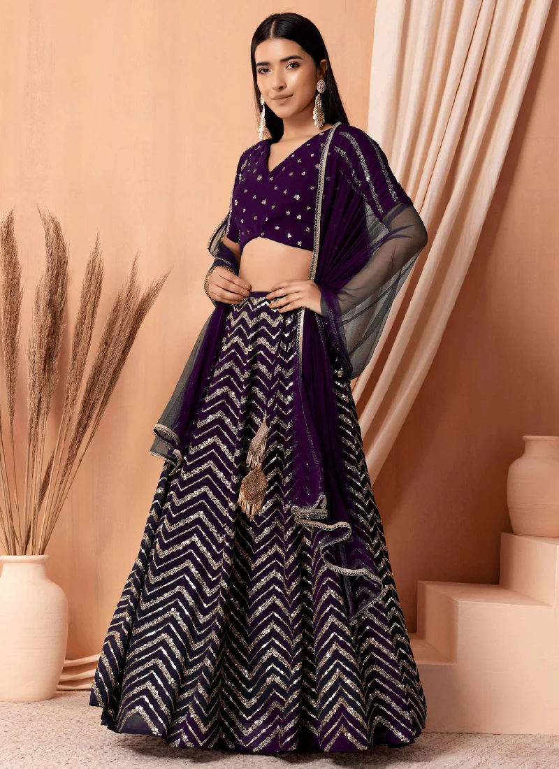 - This lehenga is made of georgette fabric in purple color designed in lehenga zigzag used material is zari sequence embroidery work.